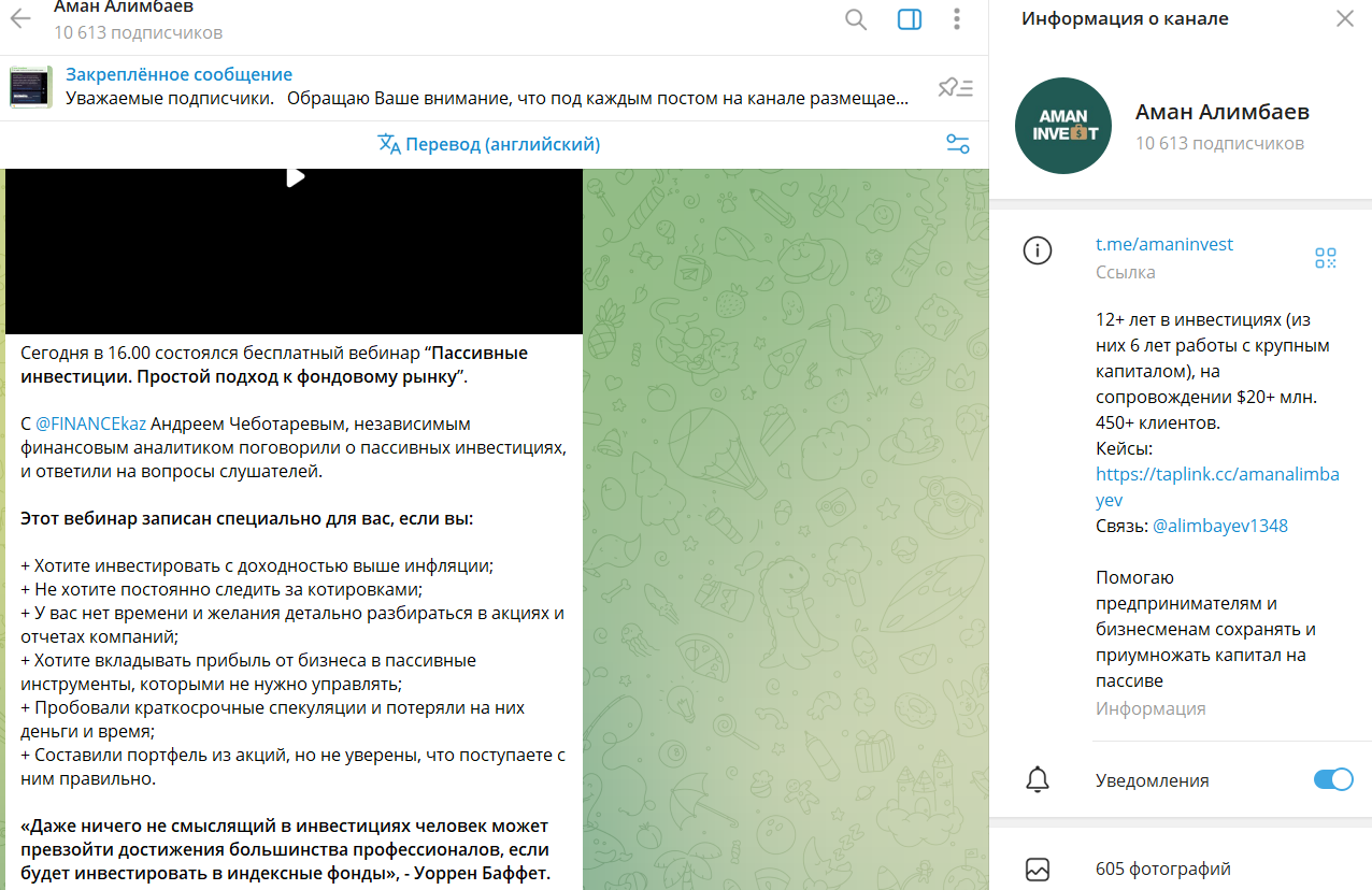 В телеграмм-канале Aman Invest автор рассказывает подписчикам о различных сферах инвестиций, финансовой грамотности, психологии, а также рекламирует свои услуги, находящиеся на отдельном сайте. На все вопросы в Телеграм эксперт отвечает на личной странице: @Alimbayev1348.