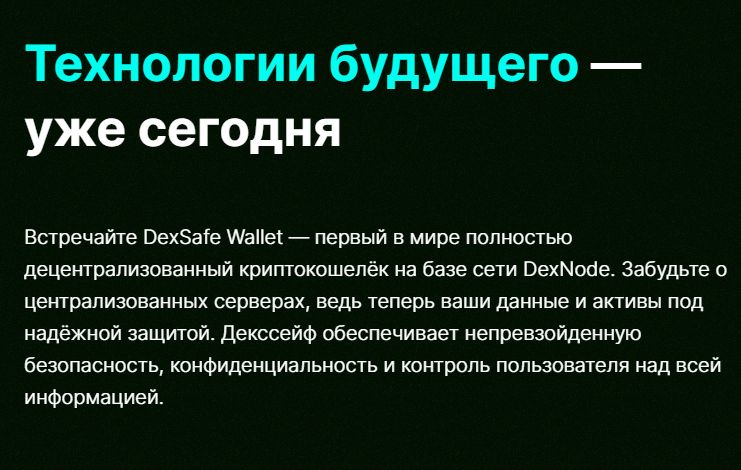 Dexsafe – это децентрализованный криптокошелек нового поколения, работающий на базе сети DexNet. Он содержит расширенный набор инструментов для хранения, обмена и управления цифровыми активами. Разработчики утверждают, что их решение устраняет зависимости от традиционных серверов. Команда проекта утверждает, что криптокошелек повышает уровень защиты и предоставляет возможности стейкинга, работы с NFT и DeFi.