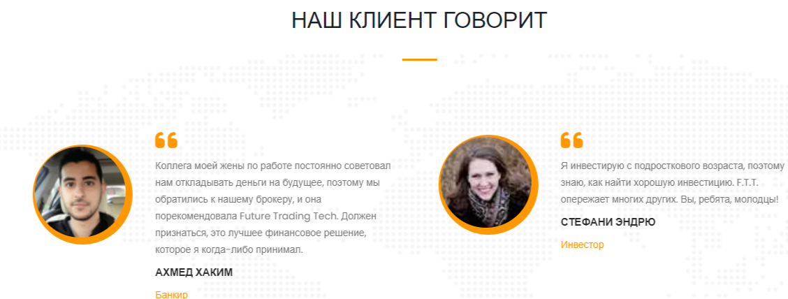 Деятельность брокера Future Trading Tech отмечена положительными комментариями. Хвалебные отзывы о безопасности площадки, быстром обслуживании и профессионализме сотрудников можно найти на официальном сайте брокерской компании. Веры данным откликам нет, так как их может писать администрация портала.