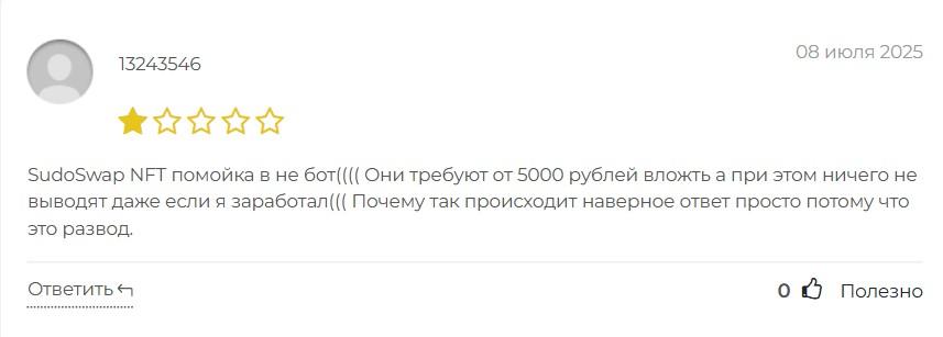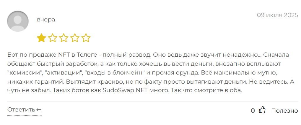 В результате в сети появляются негативные отзывы про ТГ-бот «Судосвап» (Sudo Swap), которые другие пользователи ошибочно связывают с самой биржей. Потом обманутые клиенты задаются вопросом, как вывести деньги с телеграм-ботов Sudoswap, что сделать нереально.