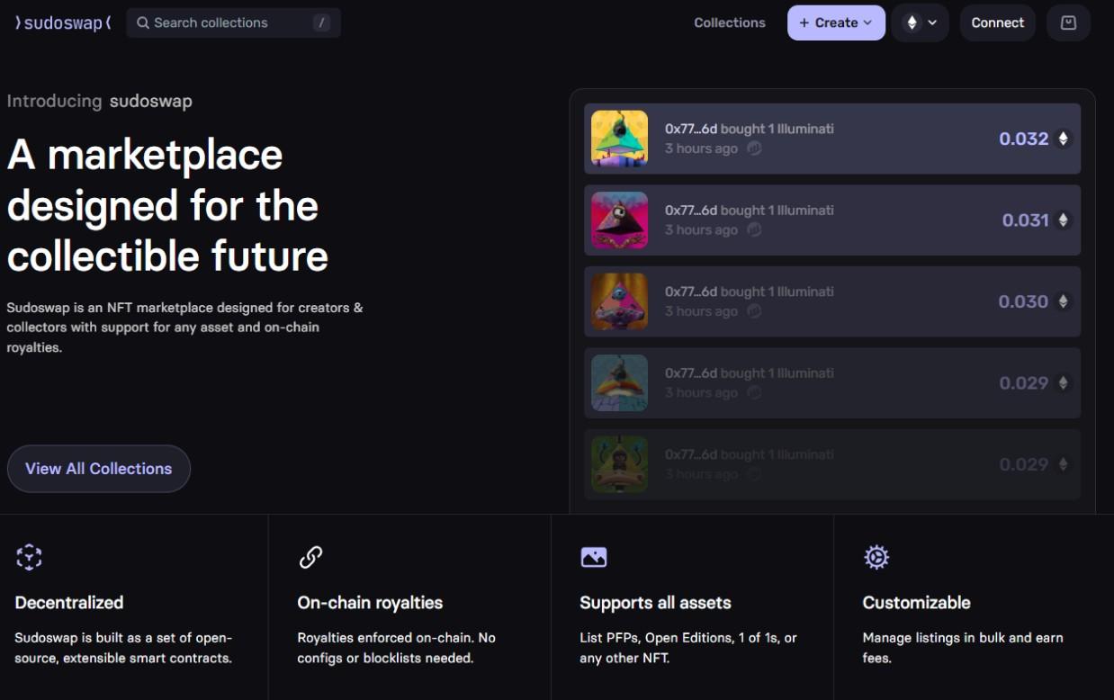 Официальный сайт Sudoswap – sudoswap xyz. Данная платформа известна держателям НФТ уже давно. Это децентрализованная биржа, где можно покупать и продавать NFT. Проект с открытым исходным кодом. Ориентирован на англоязычную аудиторию, но пользоваться им могут все желающие из любых стран мира. Платформа подходит как для создателей НФТ, так и для их коллекционеров.