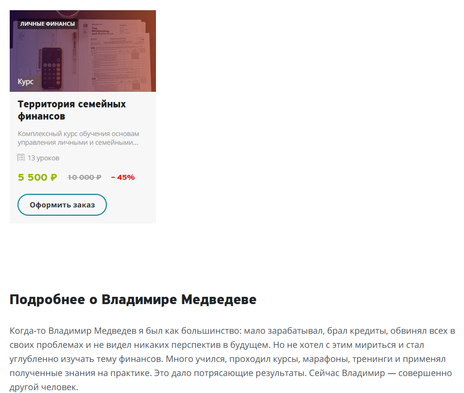 У ментора представлены разные материалы, причем некоторые вообще бесплатные, а цена на платные отличается в зависимости от площадки, например, курс «Территория семейных финансов» от Владимира Медведева, о котором оставили отзывы, на проекте Info-Hit ru стоит ₽5,500.