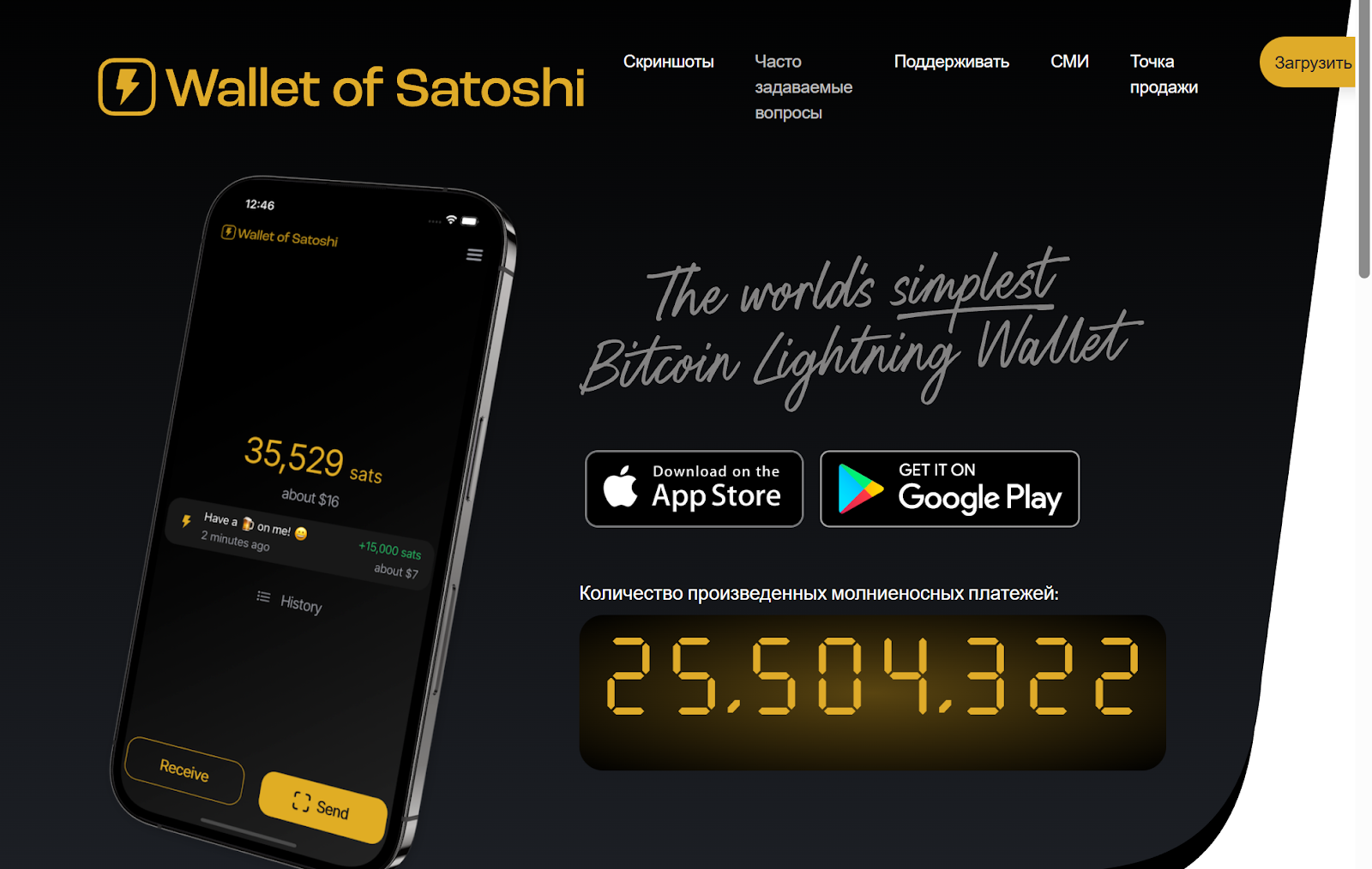 Кошелек Wallet Of Satoshi работает через приложение для смартфонов. Ссылки для загрузки доступны на главной странице, что позволяет сразу получить доступ к приложению.