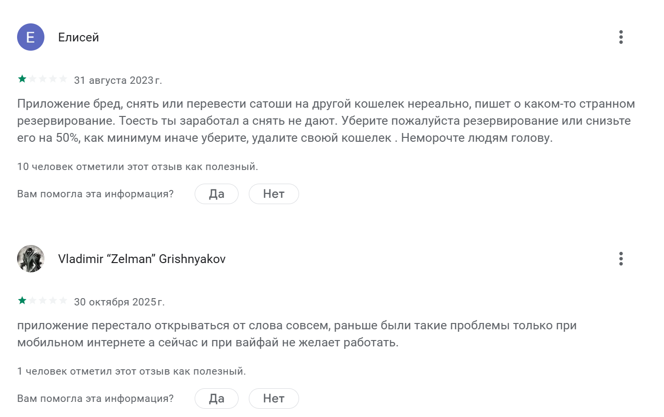 Приложение для хранения Биткоинов получило множество негативных мнений. В частности, средняя оценка в Гугл Плей составляет всего 3.3, что многое говорит о качестве софта. В отзывах о Wallet Of Satoshi клиенты жалуются на невозможность снятия и перевода Сатоши на другие кошельки. Некоторые вовсе отмечают невозможность открытия приложения даже при рабочем Wi-Fi.