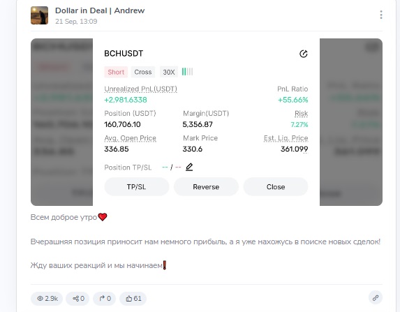 Автор канала позиционирует себя, как опытного трейдера, который специализируется на фьючерсной торговле. В ленте он размещает подробную информацию о якобы личных сделках с указанием точных точек входа/выхода и левериджем 30, что очень рисково.