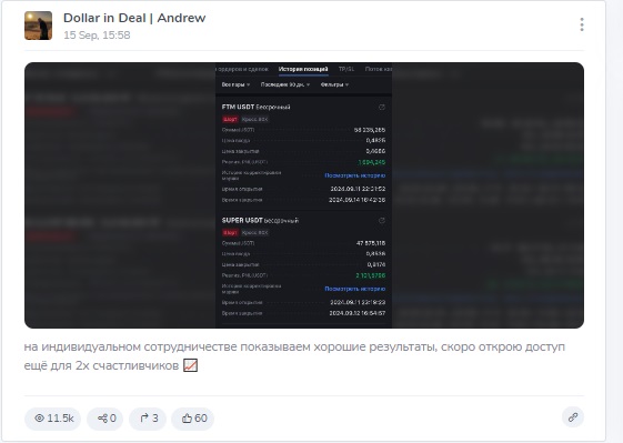 Блог в Телеграм Dollar in Deal Andrew о крипте, пока не является скамом, но делать окончательные выводы рано. Он работает всего несколько недель и пользователи еще не высказали свое мнение, но доверять Andrew не стоит, для этого есть причины: