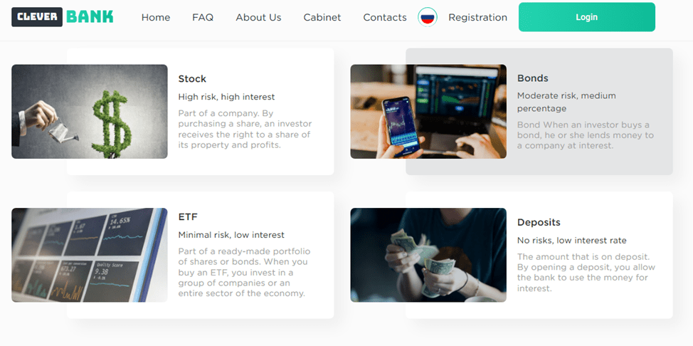 Своим клиентам «Клевер Пэй» советует не только активно пользоваться системой денежных переводов Cleverpayment Ru, но и получать пассивный доход. Инвесторам предлагается несколько перспективных направлений: акции, облигации, депозиты, специализированные фонды.