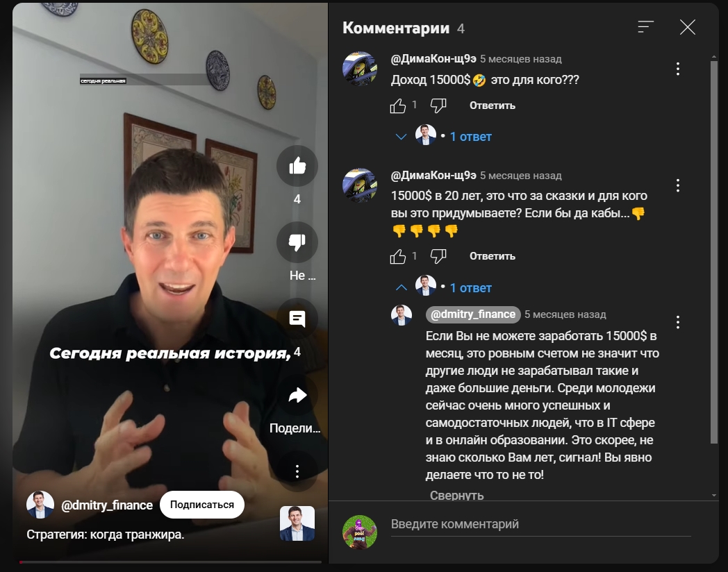 А также Дмитрий ведёт youtube-канал, в котором 162 подписчика и 246 shorts-видео. В youtube загружаются профессиональные видео о том, как торговать и инвестировать, в том числе на бирже. Настоящий канал ведется с 2020 года, но просмотров у видео мало. Ощущение, что автор выбрал неправильную систему саморекламы.
