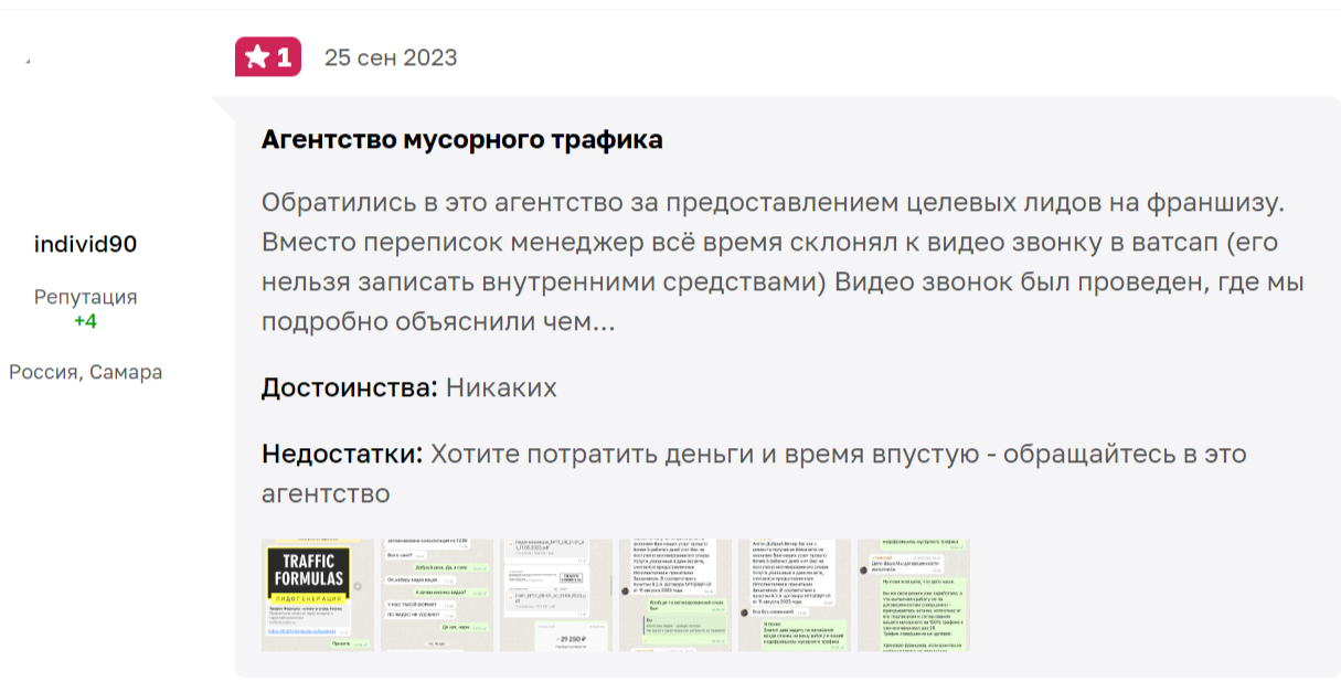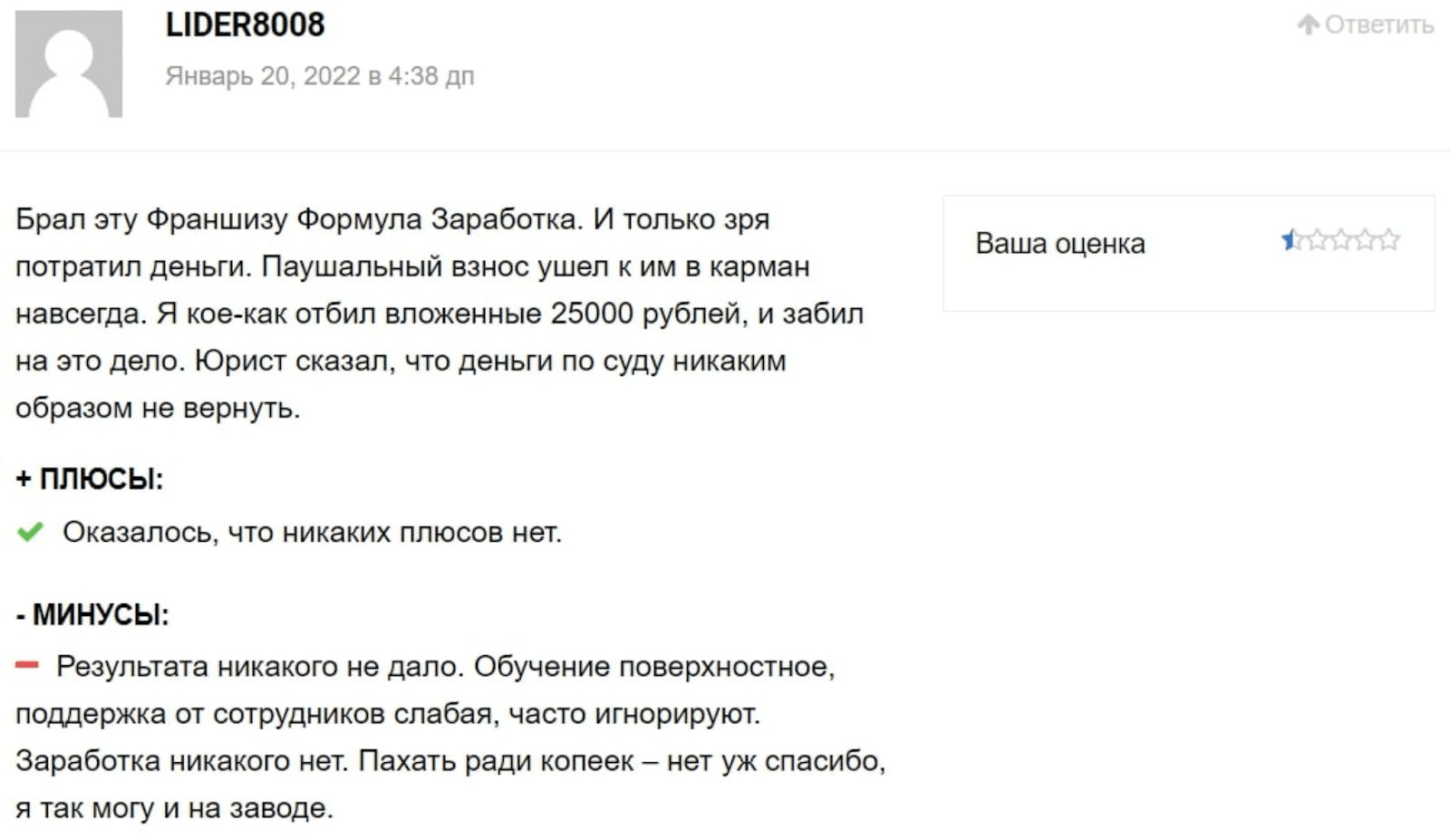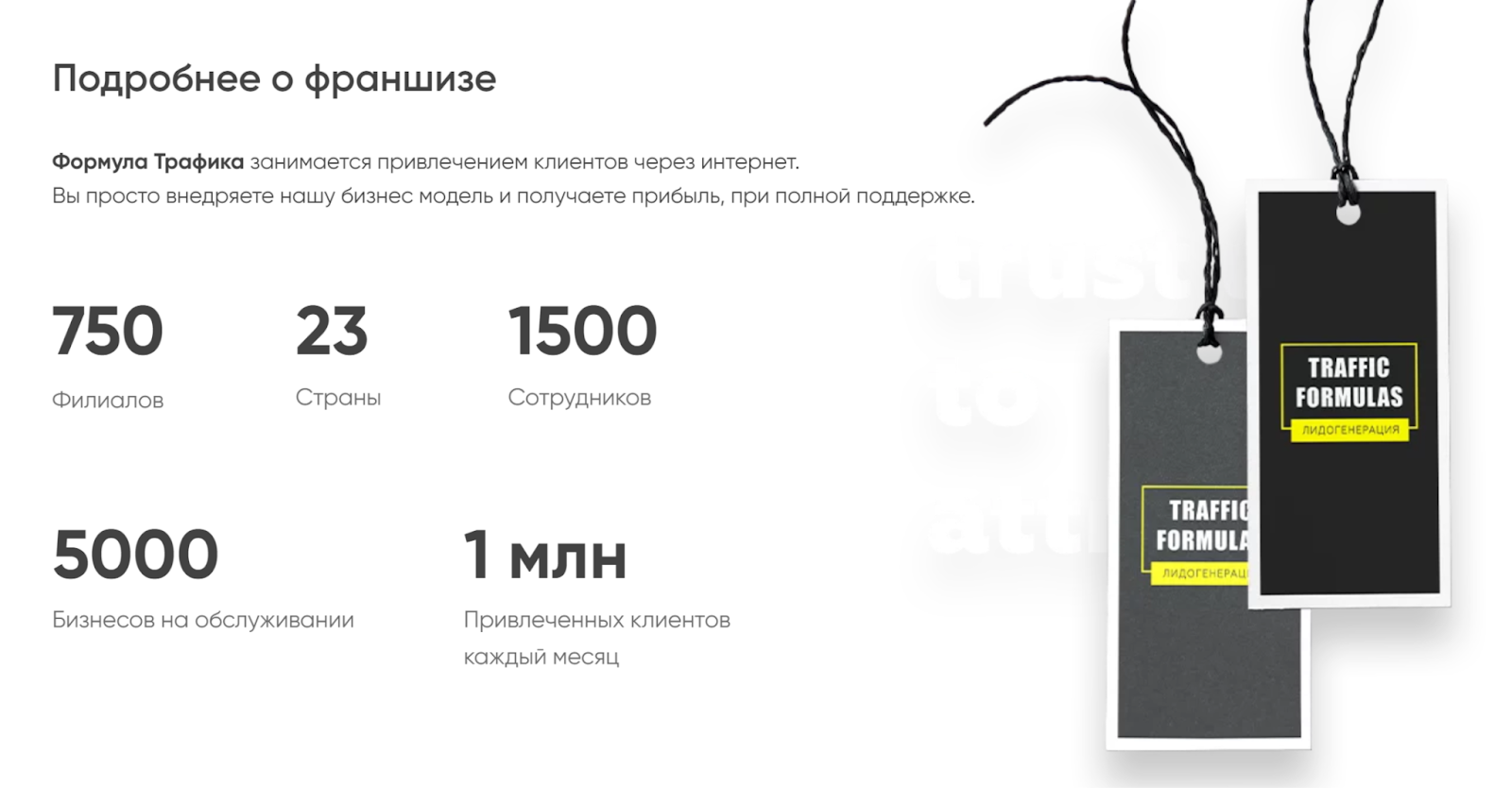 Для повышения доверия на сайте приводятся отзывы о франшизе Формула Трафика, в которых партнеры делятся опытом сотрудничества. Утверждается, что всего за месяц можно получить от 300 тыс. рублей, а годовая прибыль находится на уровне 3.6 млн. рублей. Средняя окупаемость составляет 3-7 месяцев.