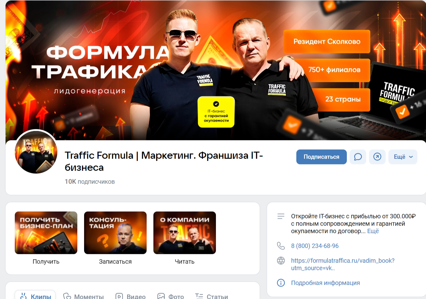Еще одна группа в ВК — Traffic Formula | Маркетинг. Франшиза IT-бизнеса. Ссылка — trafficformulas. Сообщество посвящено непосредственно бизнесу Трафик Формула. Здесь около 10 тыс. подписчиков. Где-то 1-2 раза в неделю добавляются новые публикации.
