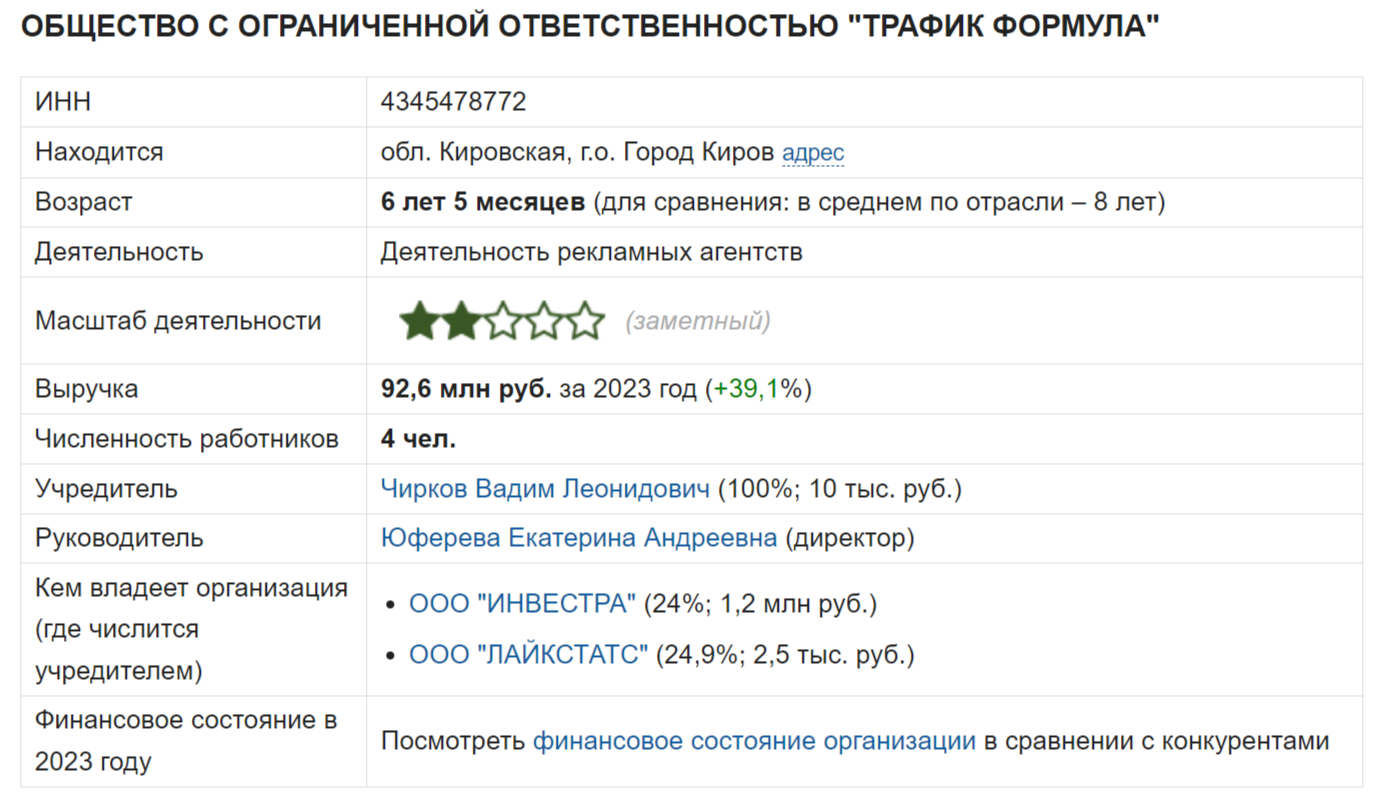 Для подтверждения того, что Формула Трафика — не развод, создатели ведут официальную деятельность. Компания зарегистрирована в качестве ООО. Проверка ИНН показала, что общество зарегистрировано еще 6.5 лет назад. Выручка за 2023-й составляет 92.6 млн. рублей.
