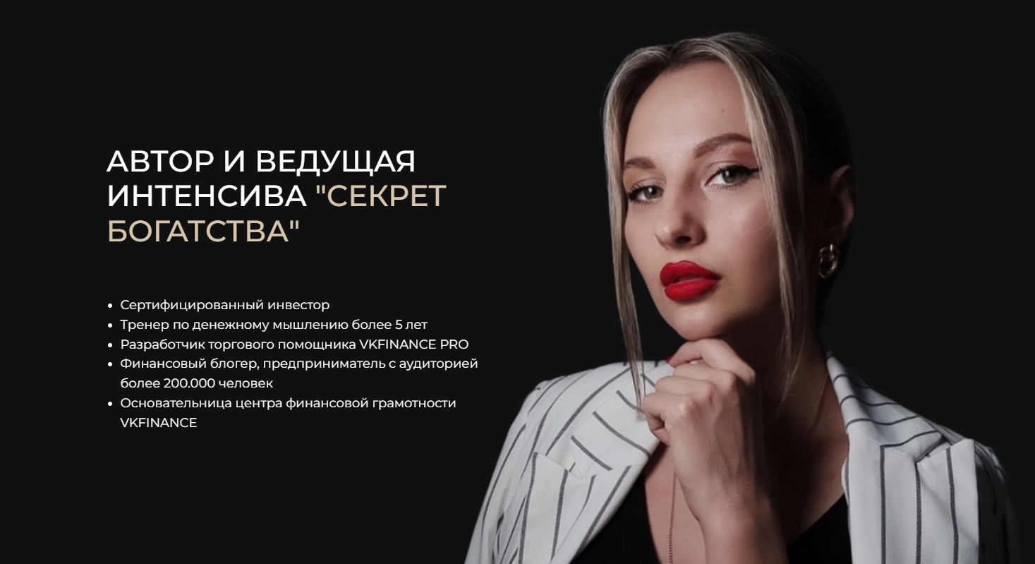 - Интенсив “Секрет богатства” — Виктория Красильникова про деньги без вложений расскажет всего за 4444 рубля.