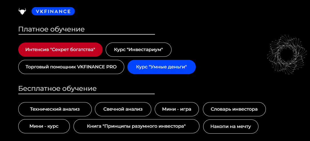 - Курс “Умные деньги” — более объёмный курс по инвестициям стоимостью от 30 до 300 тысяч рублей.